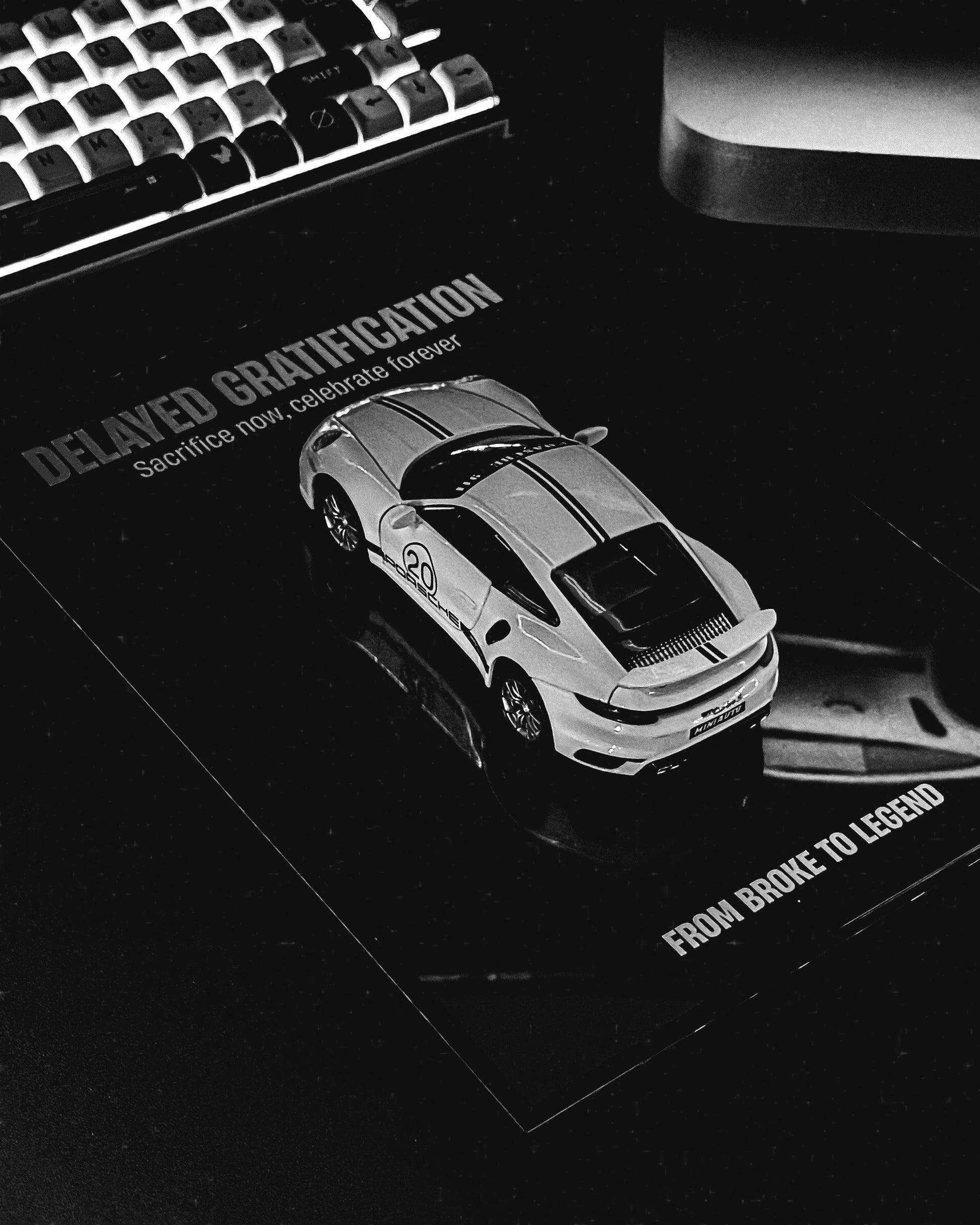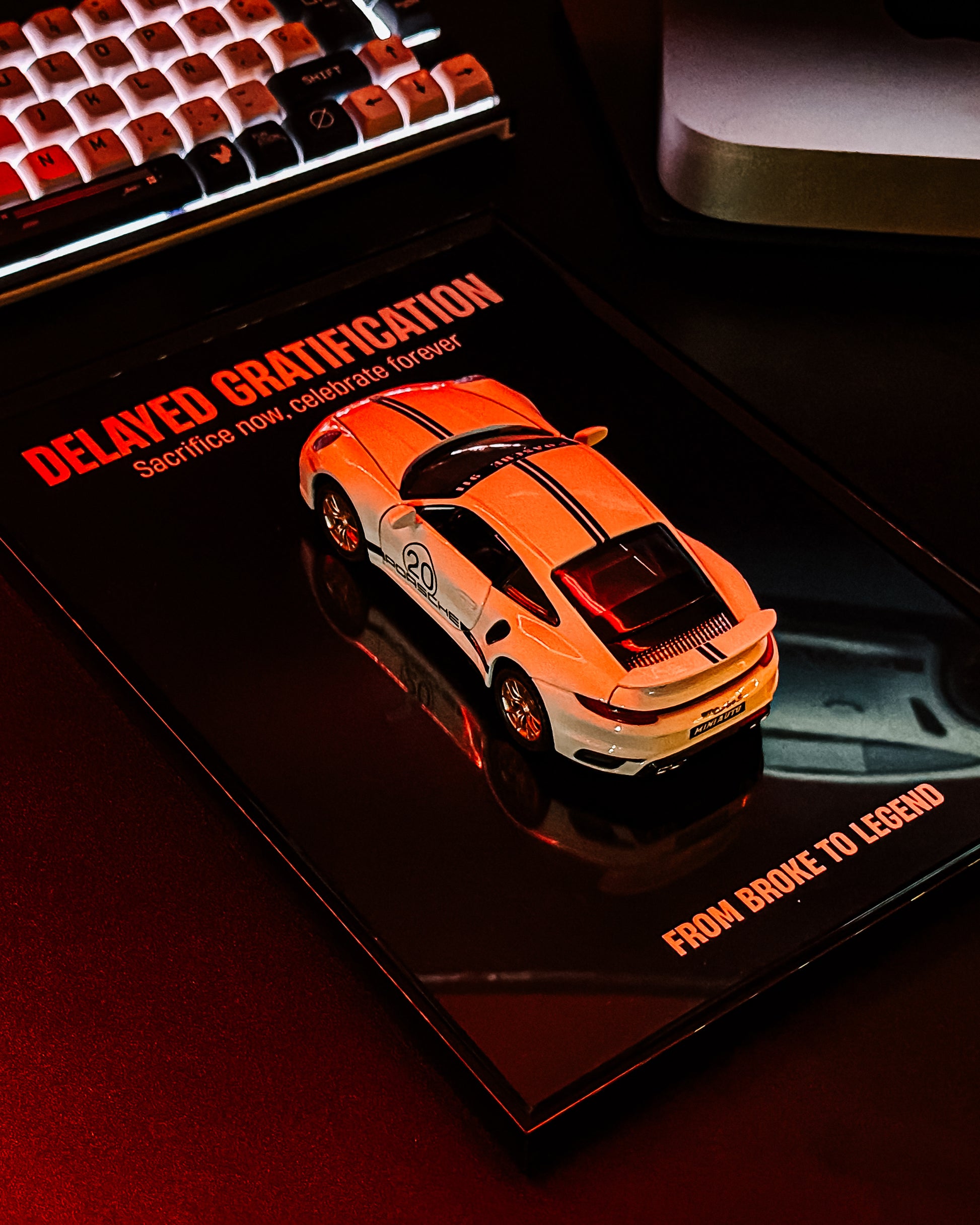 Bought this for my home office where my teenagers see it. They asked what it means, which started a great conversation about delayed gratification. Now they get why I drive a 10-year-old car while building wealth. The Porsche model is a nice touch - shows what's possible with patience. Quality is exceptional.